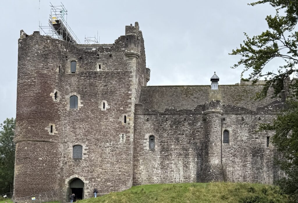 Bei Doune Castle scheitern wir am Parkplatzwächter, der uns in typisch schottischer Maniet äußerst freundlich erklärt, dass unser Auto zu groß für seinen Parkplatz sei. Trotzdem erhaschen wir ein Foto von dem Castle.