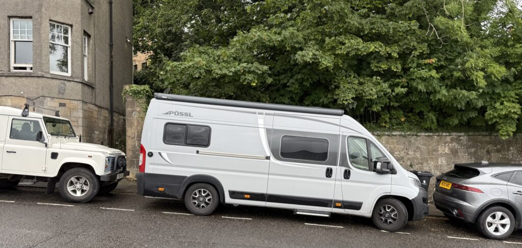 Bei unserer Besichtigung von Sterling erwischt uns ebenso ein Platzregen wie später beim Grillen, aber ich beweise, unser Bus ist nicht groß.
