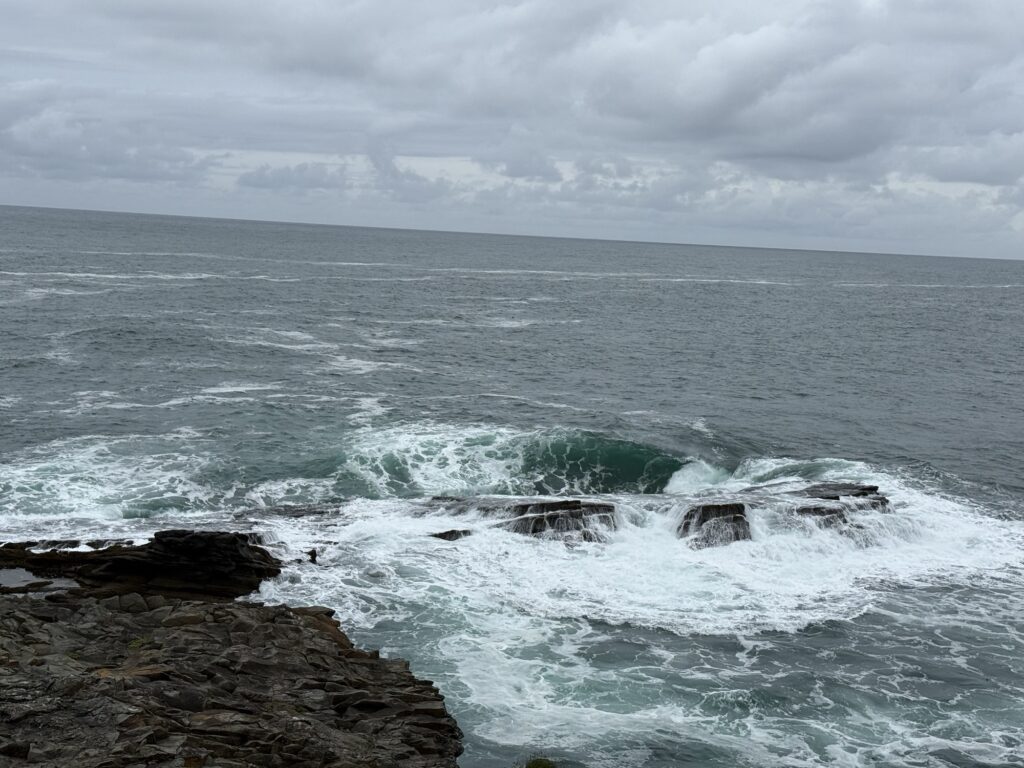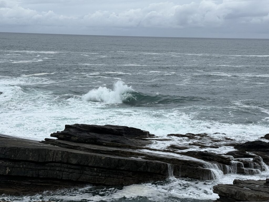 Außerhalb des geschützten Bereichs brechen sich die Wellen fantastisch auf den Schieferplatten.