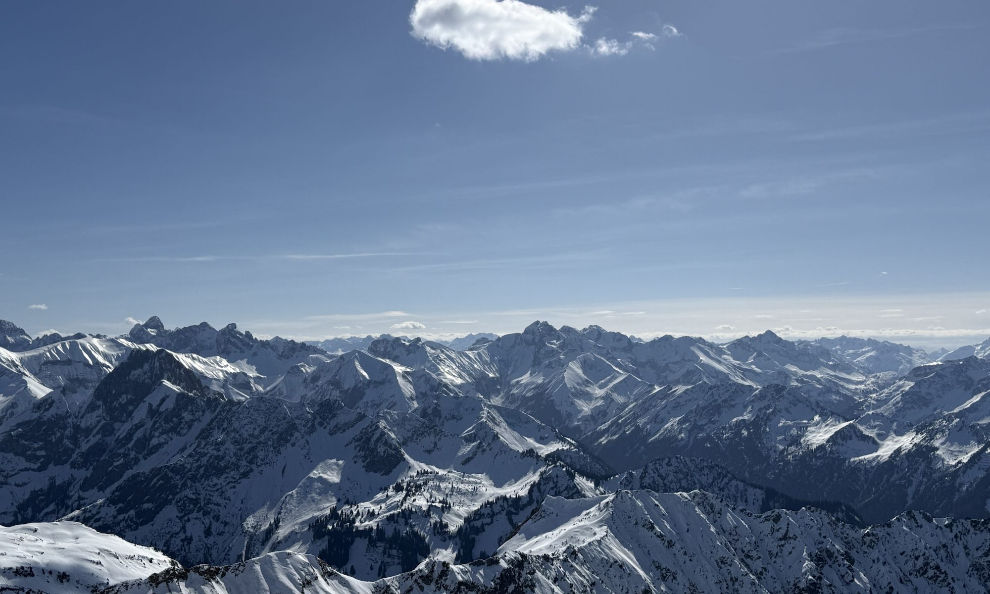 Nach kühler Nacht begrüßt uns die Sonne kurz vor neun hinter dem Schattenberg. Wir lassen ihr Zeit ihre Kraft voll zu entfalten. Pünktlich um 12:00 sind wir dann auf dem Nebelhorn und genießen das traumhafte Wetter.