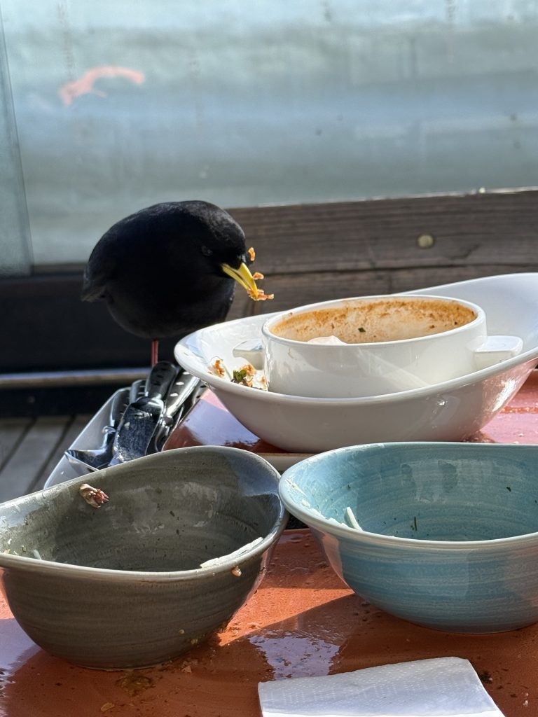 Wir lassen uns auf den Terrassen des Gipfelrestaurants verwöhnen, bevor wir den Krähen die Reste gönnen.